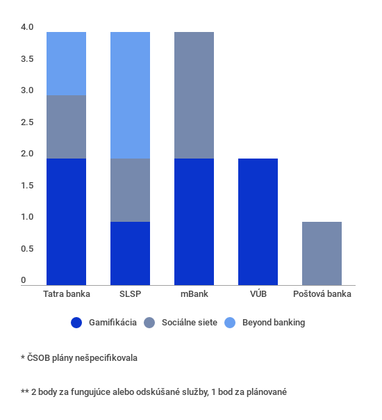 Pokiaľ však ide o užívateľský zážitok, vyfiltrovali sme ďalšie tri oblasti, v ktorých banky vo svete prinášajú inovácie. Ide o sociálne siete, gamifikáciu a tzv. beyond banking. A pozreli sme sa na to, ako sa k nim stavajú naše banky.